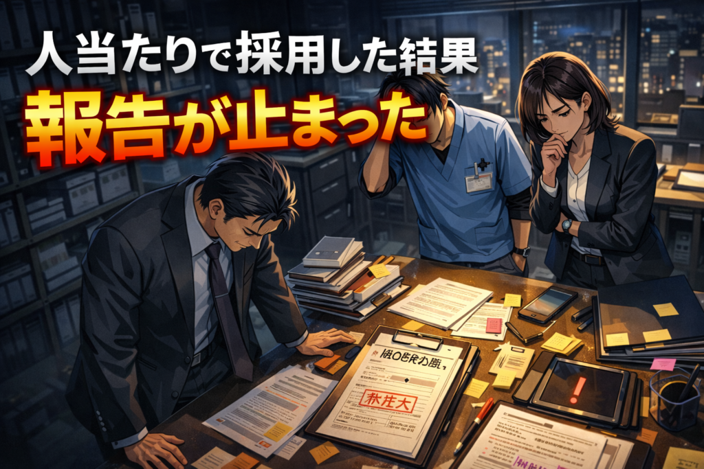 すると、面接では見えなかった情報がはっきりと浮かび上がりました。「問題を起こしたかどうか」ではなく、問題が起きたときに、どう判断してきたか。この視点を入れたことで、同社は以降の管理職採用で同じ失敗を繰り返さずに済んでいます。採用の失敗は、運や相性の問題ではありません。確認しなかった情報があっただけです。医療・介護業界では、一度の判断ミスが監査・行政対応・事業継続に直結します。
